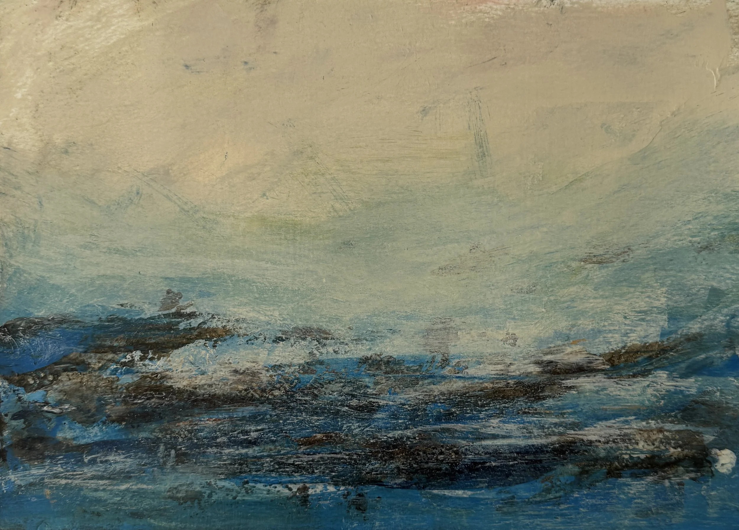 I am a self-taught artist, working primarily in oils and acrylics, and more recently, oil with cold wax medium. Each of these materials allows me to build richly textural, layered surfaces. Cold wax, with its luminous matte finish, has opened new ways for me to convey subtle shifts of light and atmosphere. My process is entirely intuitive — unfolding like music played by ear, without a fixed plan, guided instead by rhythm, colour, and emotion.